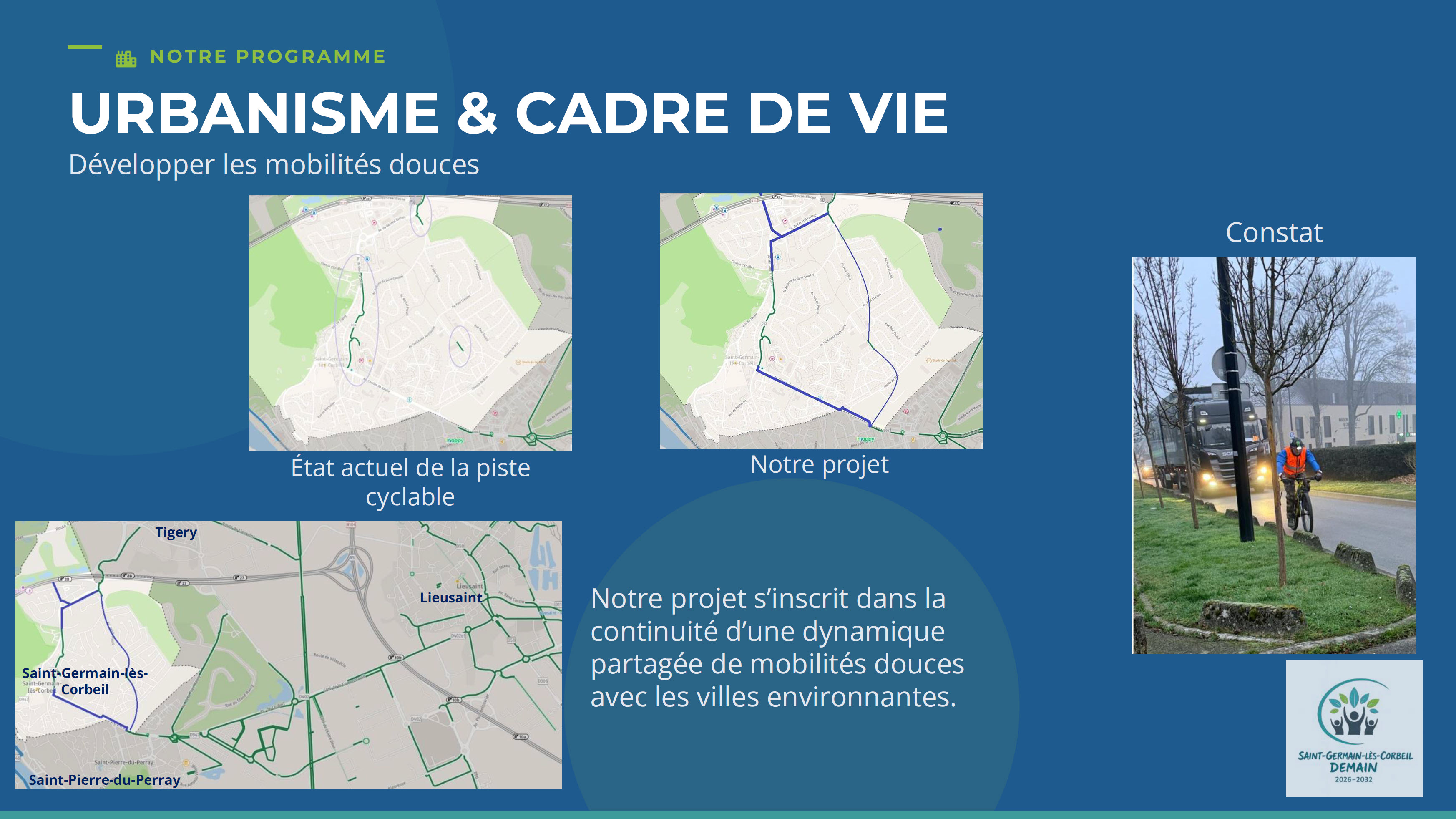 Nous prévoyons d’associer les habitants aux décisions majeures, de faire évoluer le Plan Local d’Urbanisme pour préserver le caractère pavillonnaire et les espaces naturels, de développer des mobilités plus sûres et mieux signalées, et de créer une brigade dédiée à la propreté et à la lutte contre les dépôts sauvages.